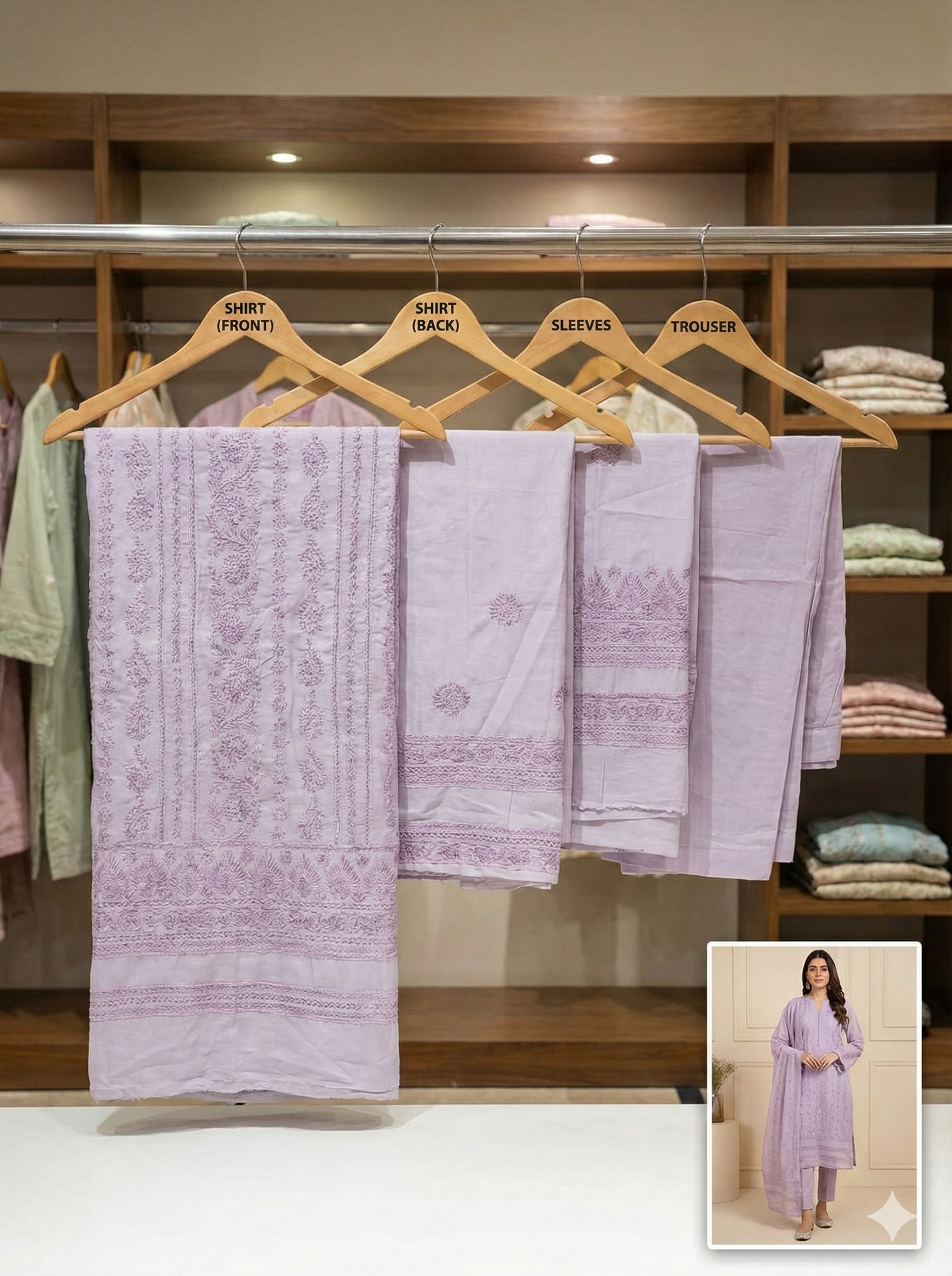 The Trouser: Includes high-quality dyed fabric for a matching lilac trouser, providing a seamless and sophisticated foundation for the outfit.