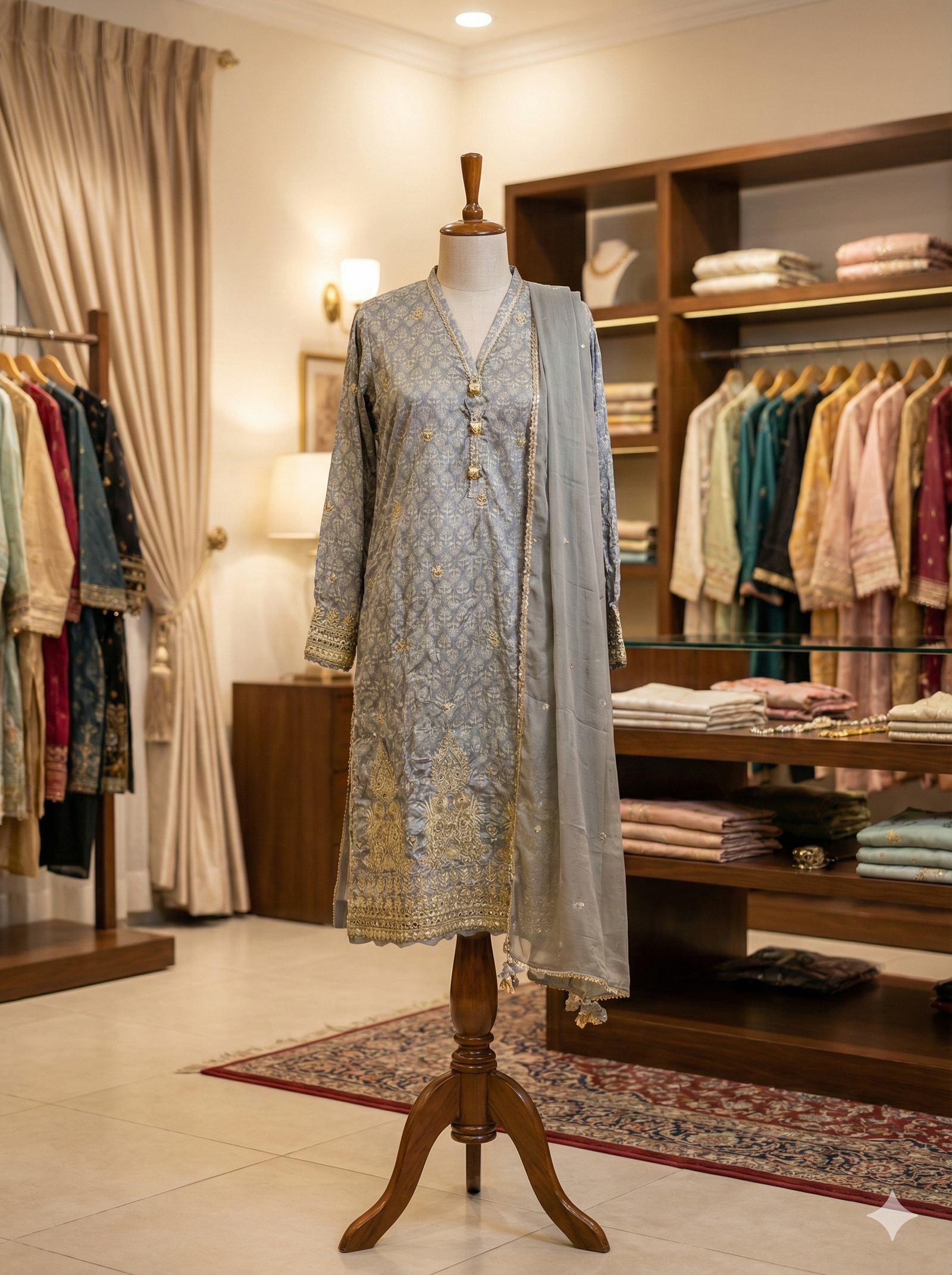 The Shirt (Kameez): A shimmering steel grey shirt adorned with an all-over traditional jacquard weave and delicate golden threadwork.