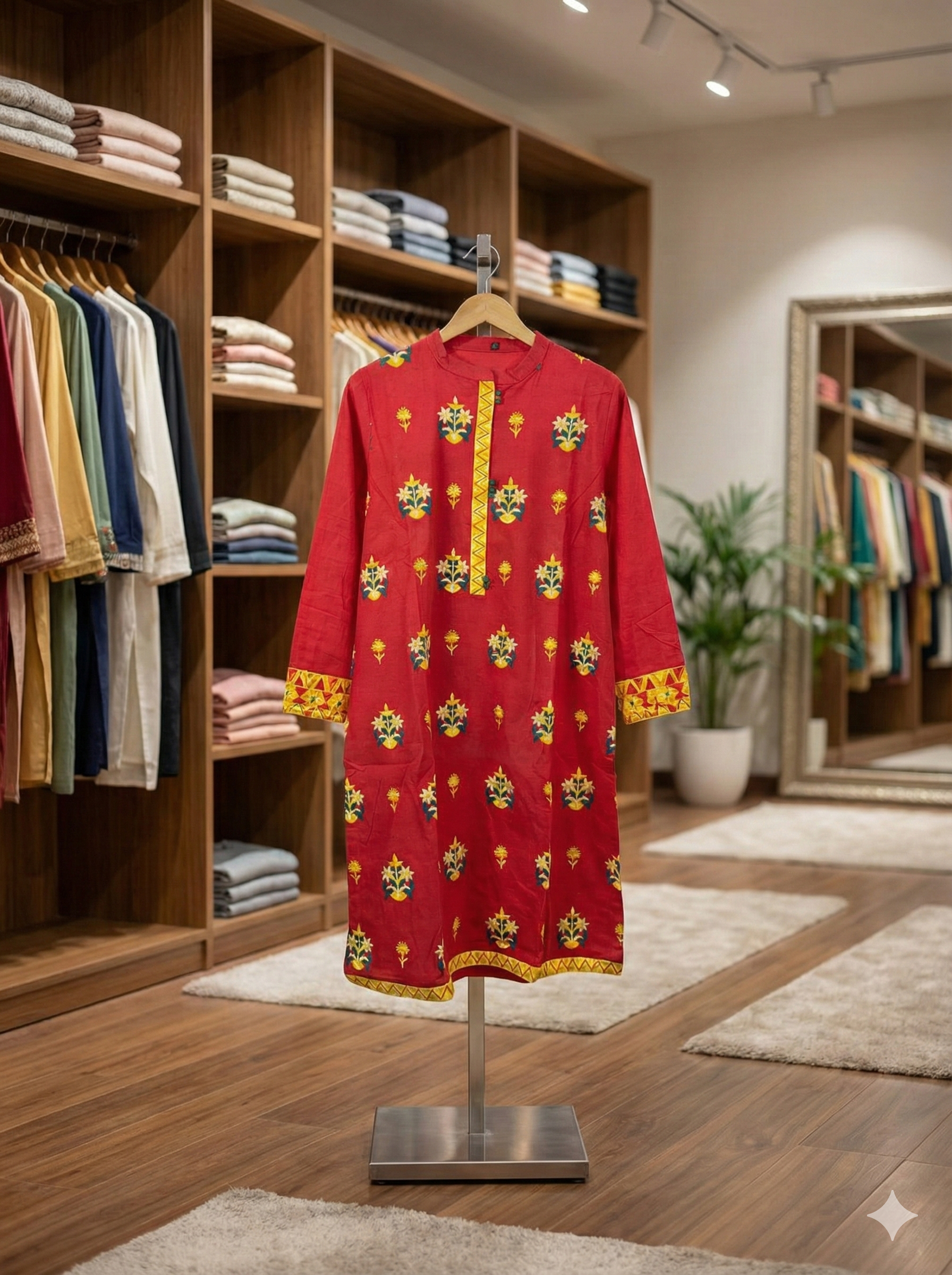 • Design: Red base with yellow floral motifs and geometric accents.