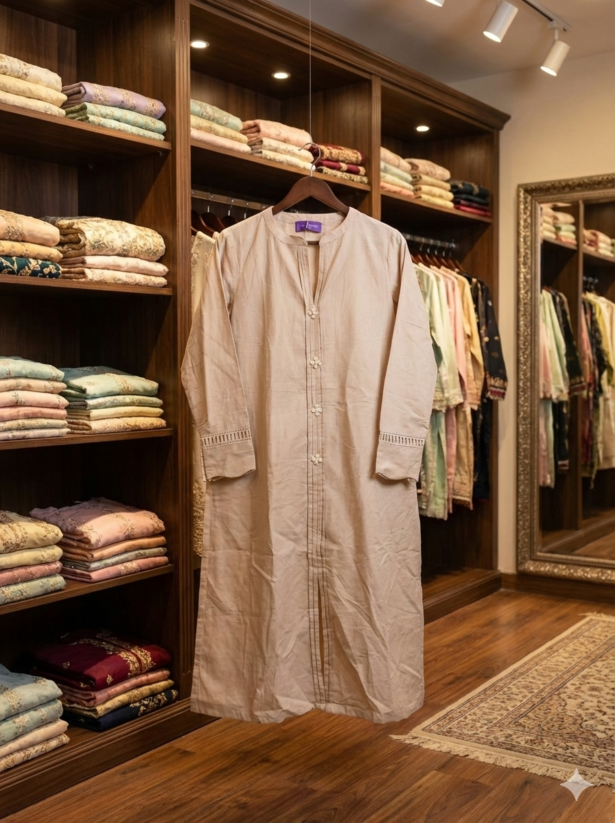 Discover the art of understated luxury with Saya’s latest 2-piece ready-to-wear collection. This exquisitely tailored kurta in a soft, neutral beige features a classic band collar with a V-split, adorned with delicate floral buttons and structured pleating down the placket. The look is finished with intricate lace detailing on the cuffs, adding a touch of feminine grace. Paired with matching trousers, this ensemble is the perfect blend of comfort and sophistication for your daily wear.